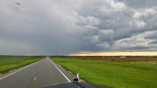 Seems like if I get into bad weather, it likes to happen when I'm also getting into traffic. So here at this point, I got off the toll road and headed up through Wichita, right on the cusp of the going home rush. The temperature dropped 17 degrees in a mile and a half, and the buckets fell out of the sky at about the same time. To add to all this pleasurable fun, the windows fogged over and the defroster chose that moment to go on one of it's strikes (it's a problem we've been trying to figure out and finally have it fixed now...now that we probably won't need it for several months).